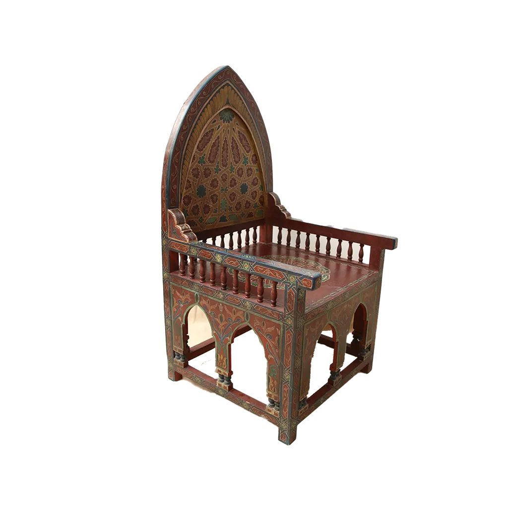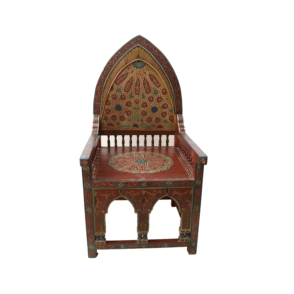 Cette chaise unique, véritable chef-d’œuvre de l’antiquité marocaine, incarne l’apogée de l’artisanat d’art mauresque. Entièrement façonnée et décorée à la main, elle constitue une pièce d’exception témoignant d’une minutie hors du commun.