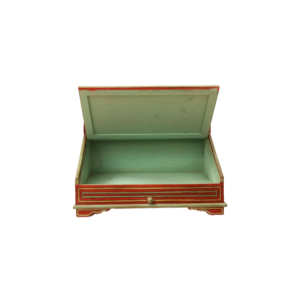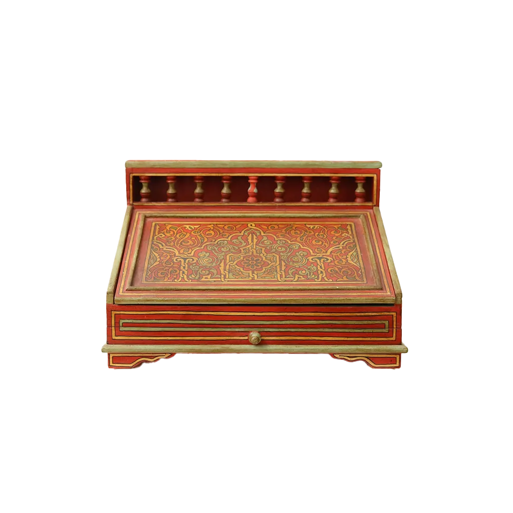 The surface is entirely covered with polychrome paint executed using the ancient Zouak technique. Each floral motif and geometric interlacing is hand-painted with natural pigments. The dominant colors—henna red for fertility, emerald green for paradise, and saffron yellow for wealth—intertwine in perfect symmetry. These decorations are not merely aesthetic; they act as protective talismans for the new home.