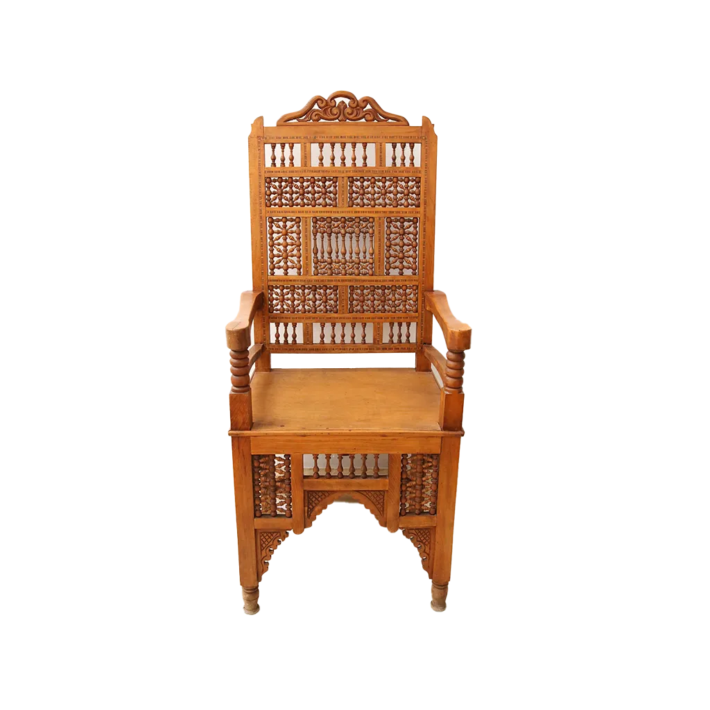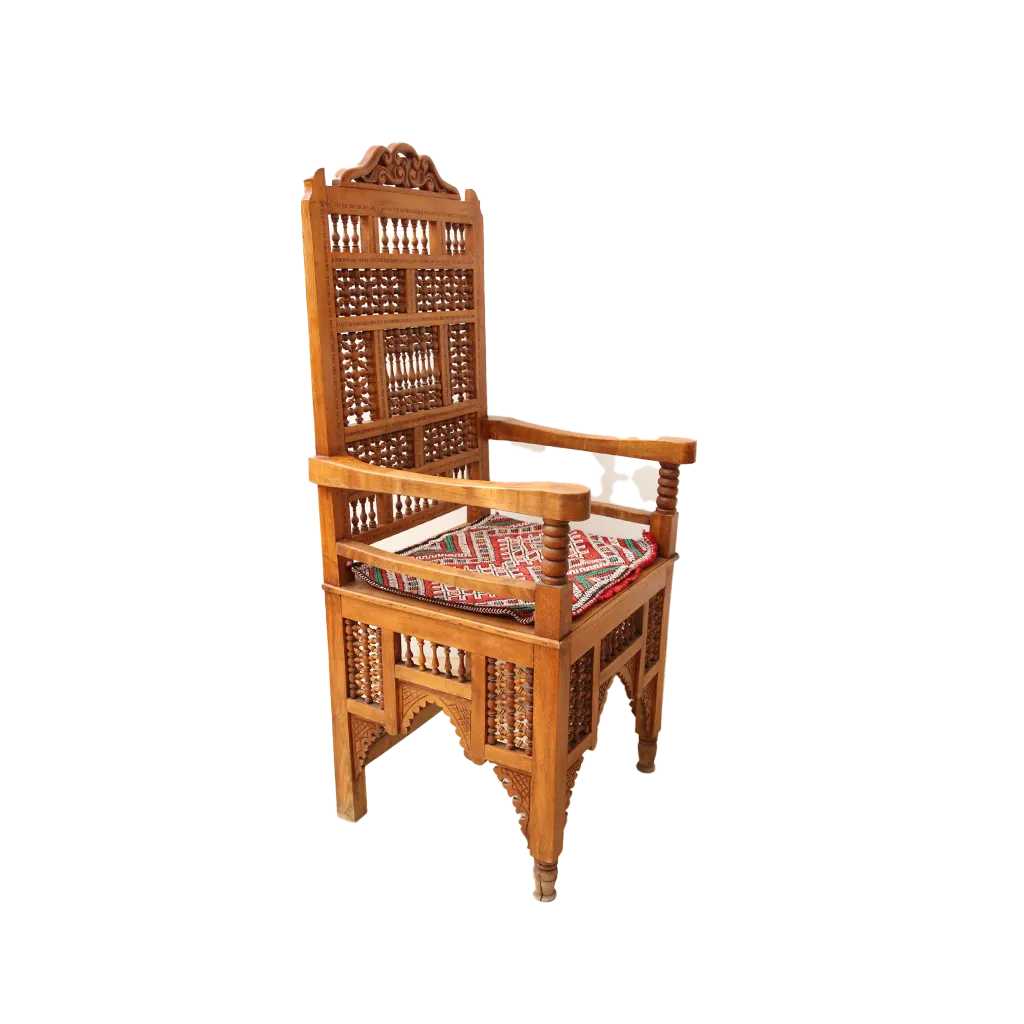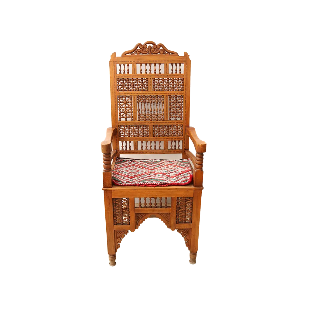 The centerpiece of this armchair lies in its backrest and armrests, which feature remarkably delicate Moucharabieh work. This wooden latticework, composed of hundreds of small pieces turned and assembled with millimeter precision, creates a play of geometric light and shadow of rare elegance. This ancient technique, which combines engineering and aesthetics, transforms the wood into a rigid lacework, preserving privacy while allowing air to circulate.