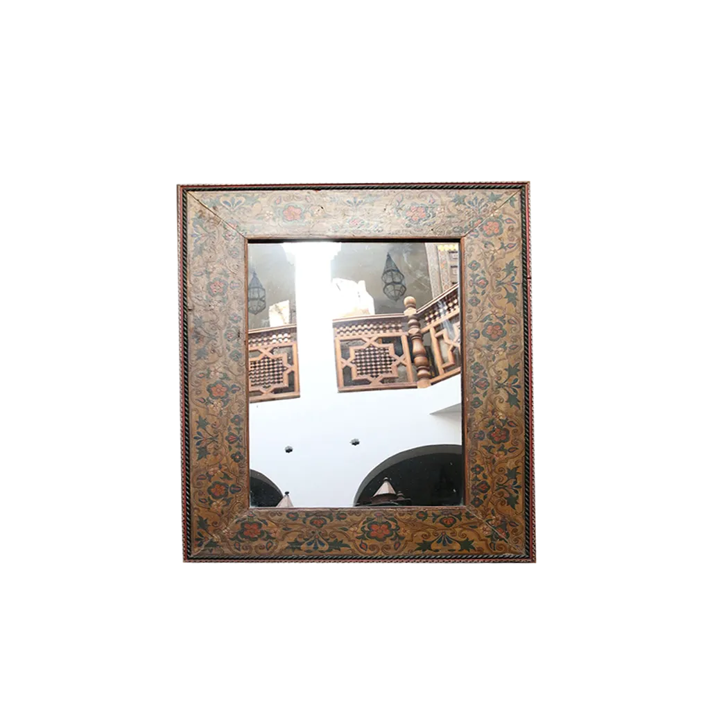 This wall mirror is a burst of color and history, a piece of Moroccan craftsmanship that transcends its primary function to become a central decorative element. Framed in cedar wood, this mirror is a vibrant celebration of the ancient wood-painting technique known as Zouak.