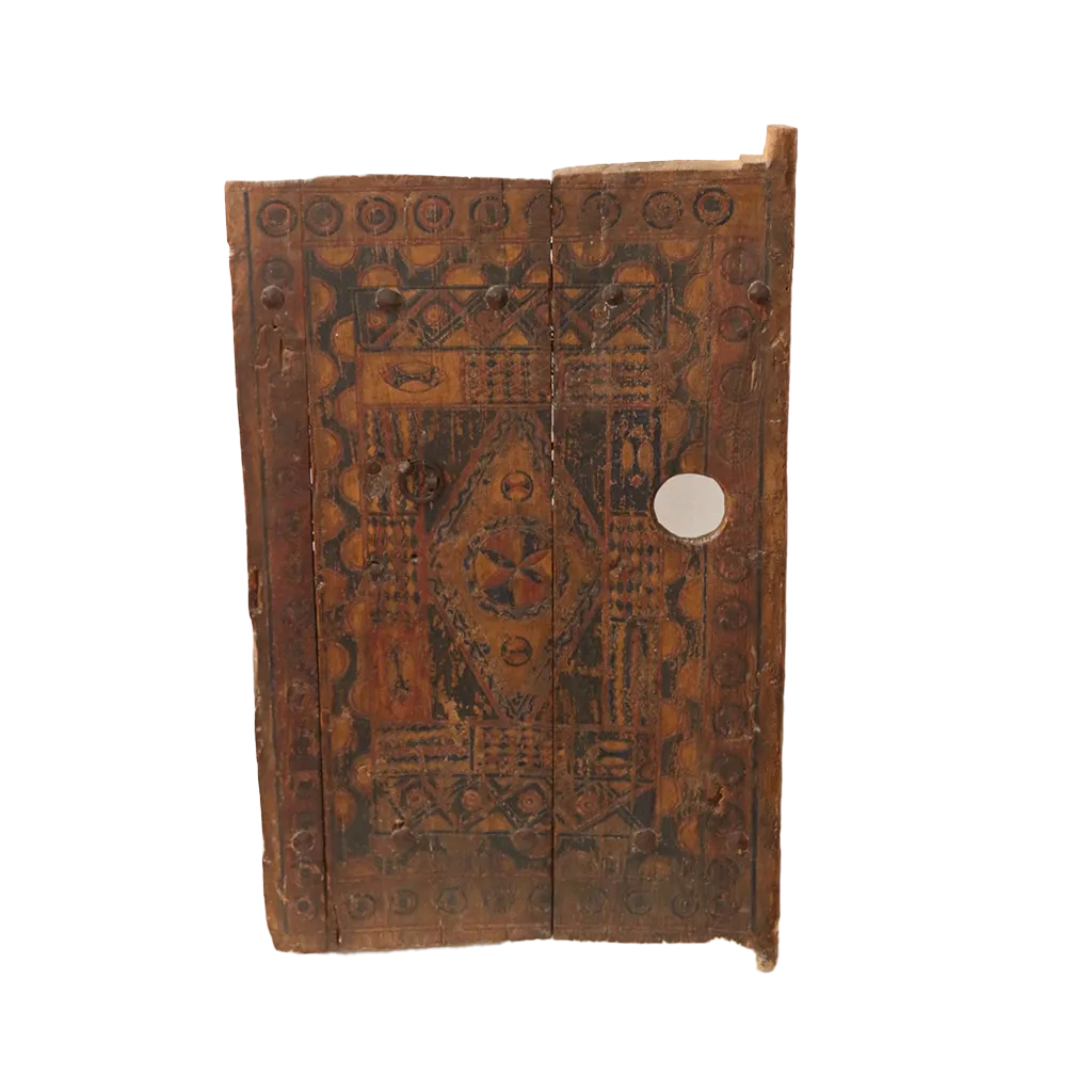 The wood’s natural patina is enhanced by authentic pigments extracted from local minerals and plants, offering shades of saffron, henna, and ochre reminiscent of the mountain landscapes. Each notch in the wood tells a story of patience, where the artisan’s chisel has given life to an imposing, symmetrical structure. The hand-forged iron fittings add a touch of strength and rustic elegance, making this door much more than a simple entrance: a true visual archive of Moroccan heritage.