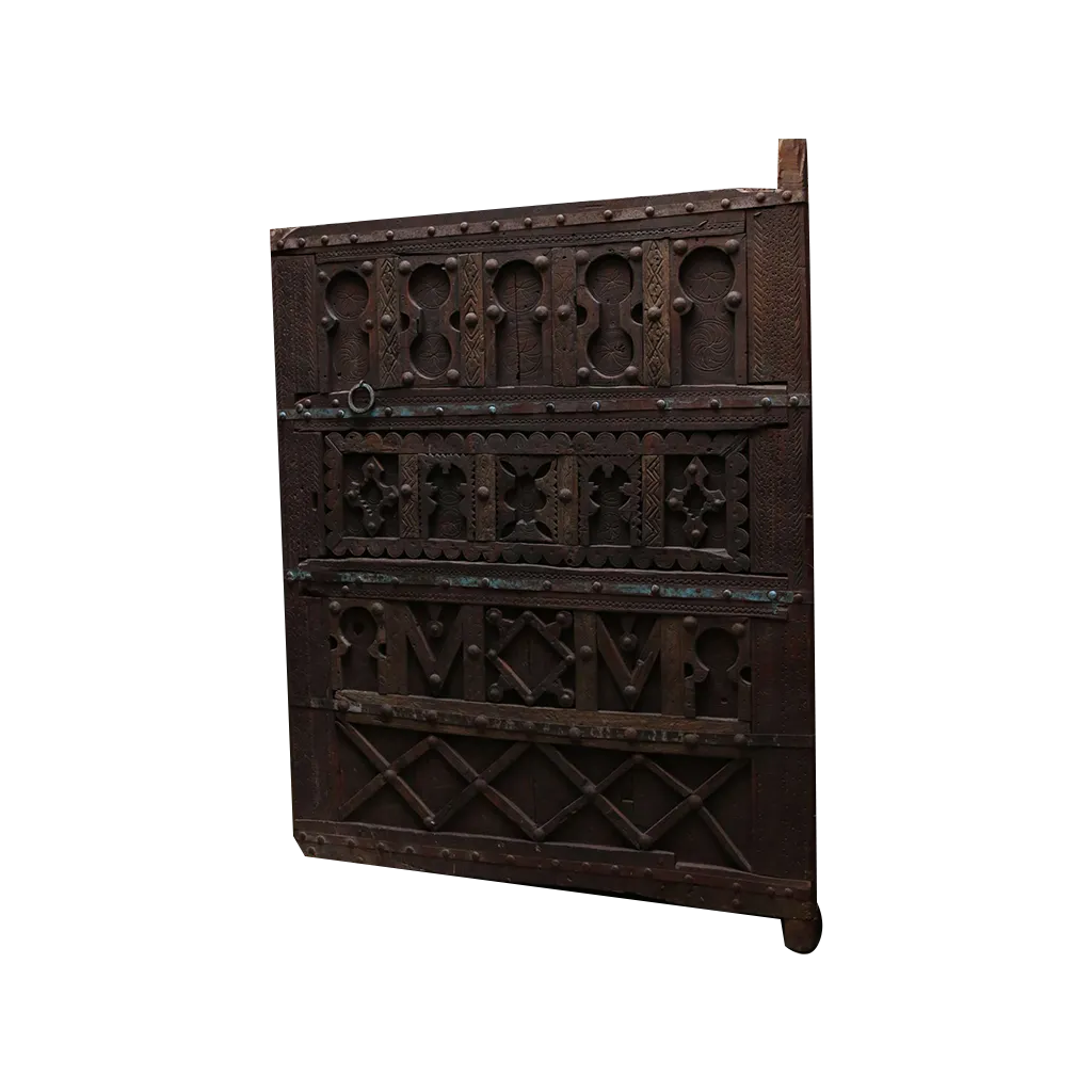 The wood’s natural patina is enhanced by authentic pigments extracted from local minerals and plants, offering shades of saffron, henna, and ochre reminiscent of the mountain landscapes. Each notch in the wood tells a story of patience, where the artisan’s chisel has given life to an imposing, symmetrical structure. The hand-forged iron fittings add a touch of strength and rustic elegance, making this door much more than a simple entrance: a true visual archive of Moroccan heritage.