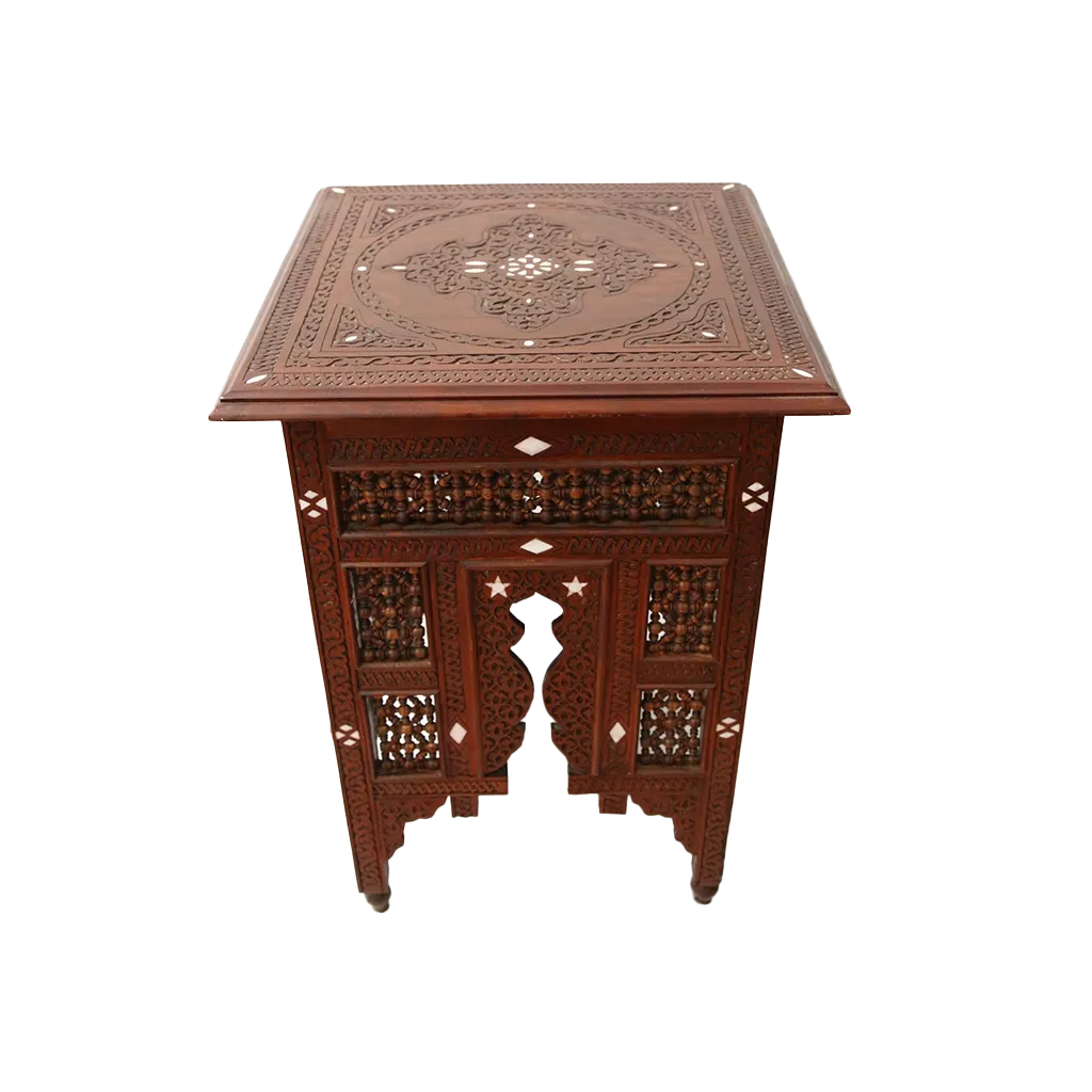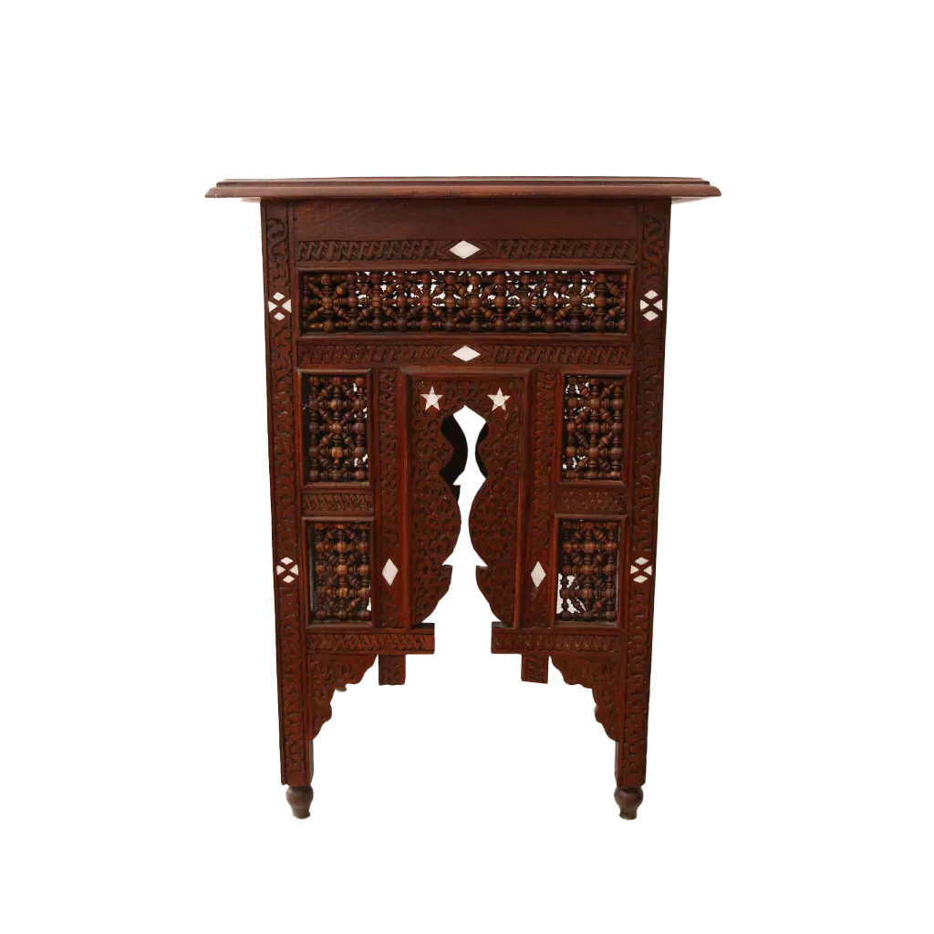 These majestic side tables, true jewels of fine woodworking, represent the pinnacle of refinement and meticulous craftsmanship. Crafted from solid walnut with deep, dark grain, they showcase one of the most prestigious skills in the Arab world: the art of mother-of-pearl marquetry, or Sadaf (صدف).
