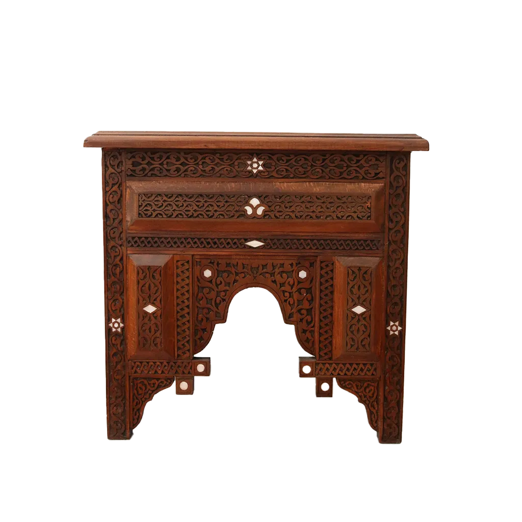 These majestic side tables, true jewels of fine woodworking, represent the pinnacle of refinement and meticulous craftsmanship. Crafted from solid walnut with deep, dark grain, they showcase one of the most prestigious skills in the Arab world: the art of mother-of-pearl marquetry, or Sadaf (صدف).