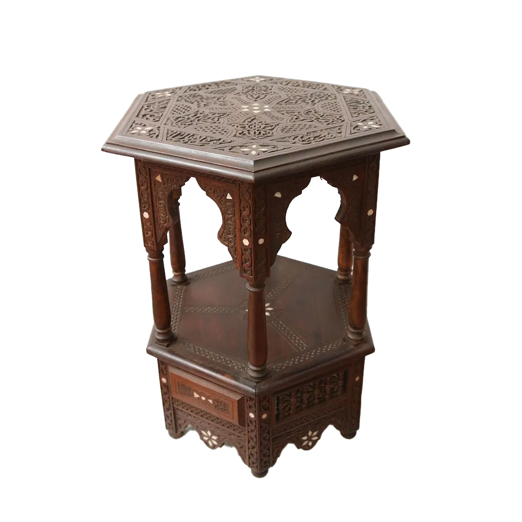 These majestic side tables, true jewels of fine woodworking, represent the pinnacle of refinement and meticulous craftsmanship. Crafted from solid walnut with deep, dark grain, they showcase one of the most prestigious skills in the Arab world: the art of mother-of-pearl marquetry, or Sadaf (صدف).