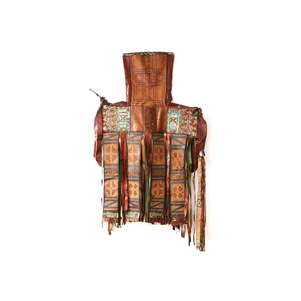 The bag’s surface is a canvas for intricate geometric ornamentation. Engraved, punched, and braided patterns cover every square centimeter. It features traditional Tuareg symbols, such as southern crosses, diamonds and broken lines, acting as protective talismans and markers of clan identity.
